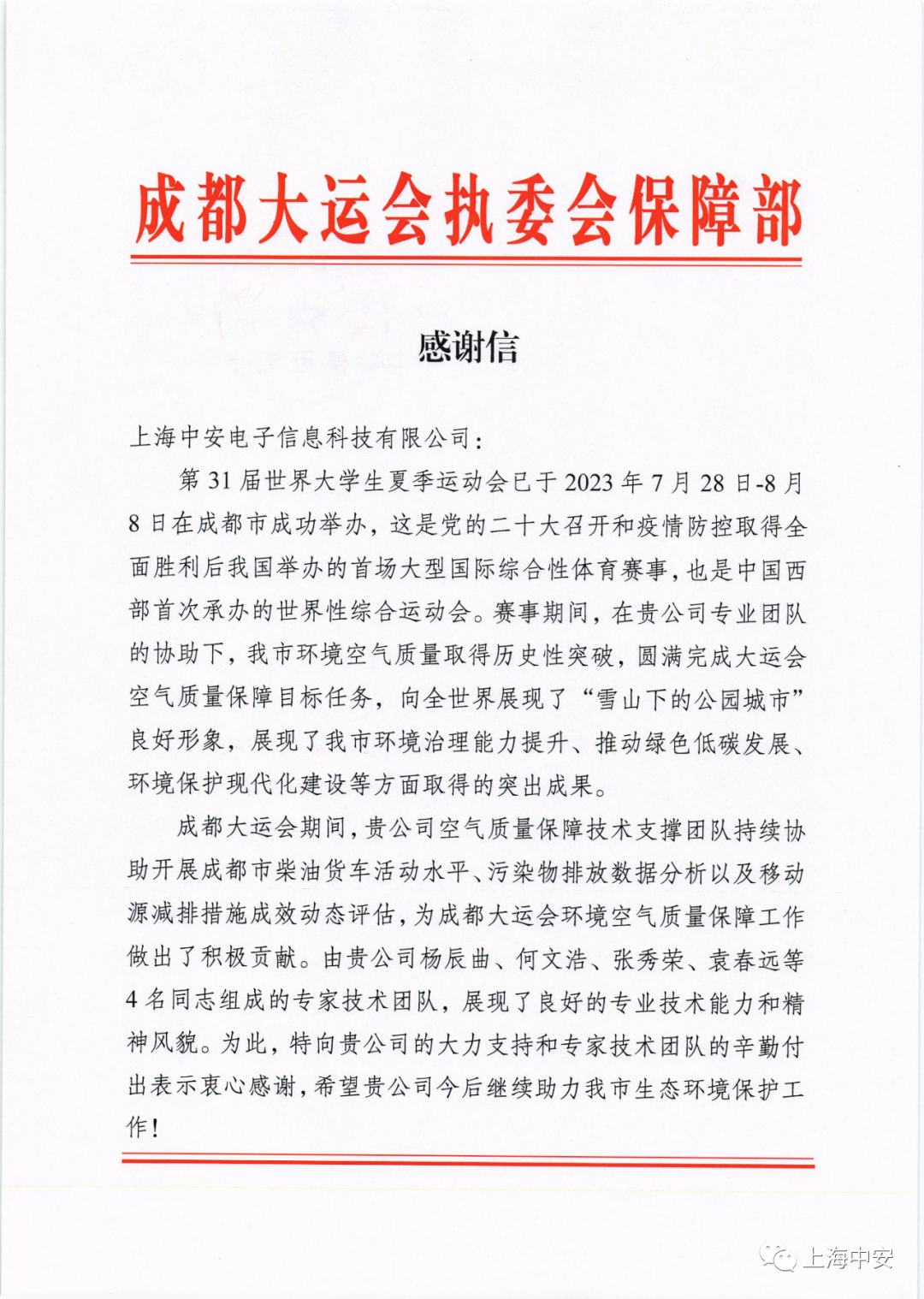 成都大運會執(zhí)委會保障部發(fā)來一封感謝信!(2023-10-15)