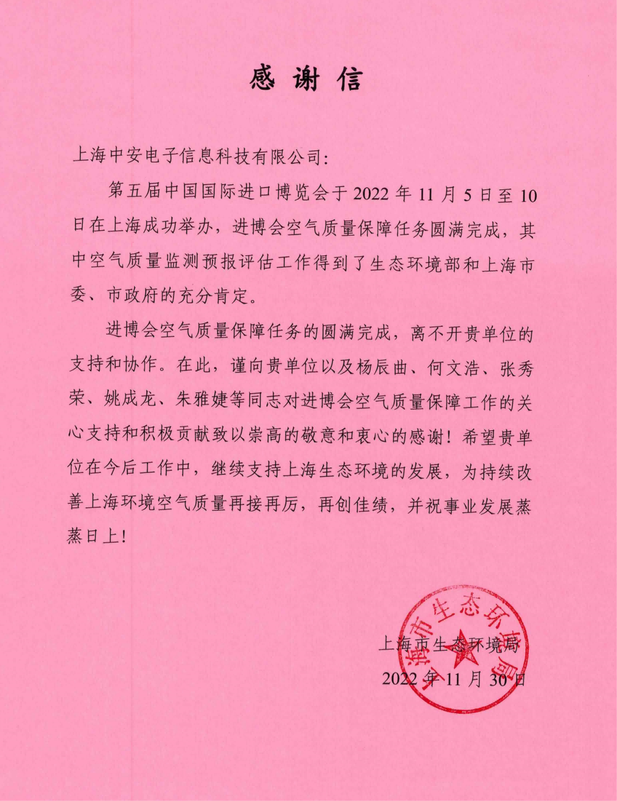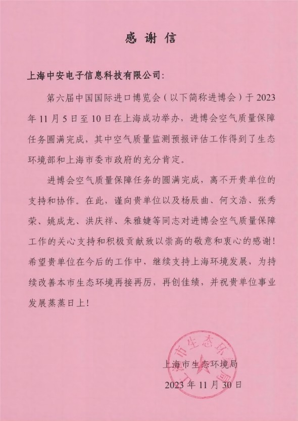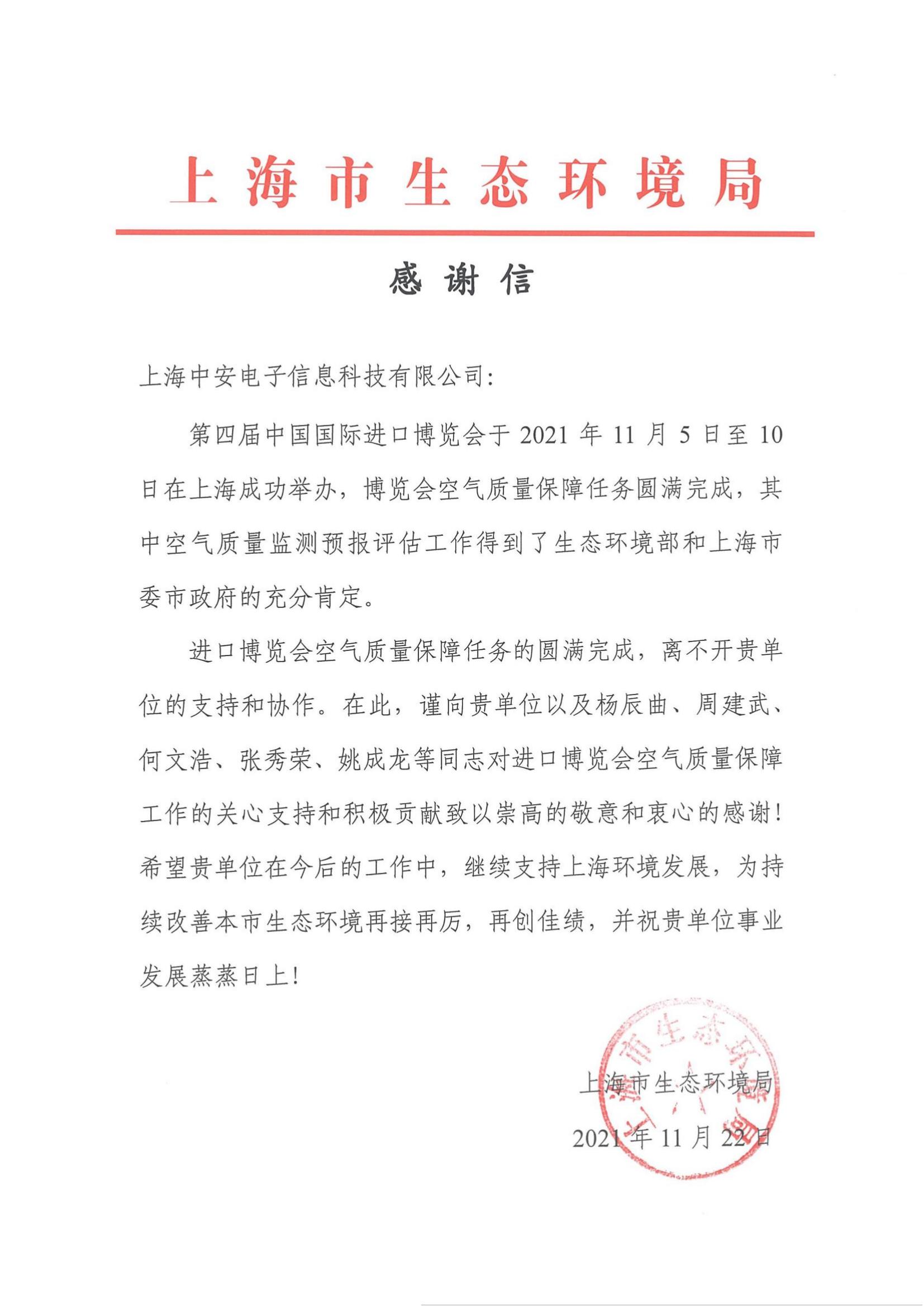 上海環(huán)監(jiān)中心就中安科技在21年國際進博會空氣質(zhì)量監(jiān)測預報工作中杰出貢獻送來感謝信?。?021/12/31)